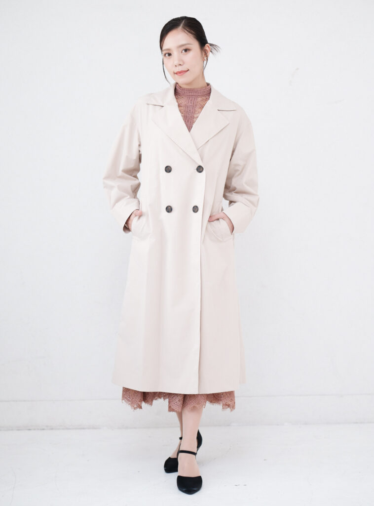 シンプルながらも品のあるシルエットが魅力のロングトレンチコート。ウエストのさりげないシェイプと長めのバックヨークが、エレガントな印象を引き立てます。どんなスタイルにもマッチするベーシックなデザインで、秋冬の顔合わせや結婚式にもぴったりです。