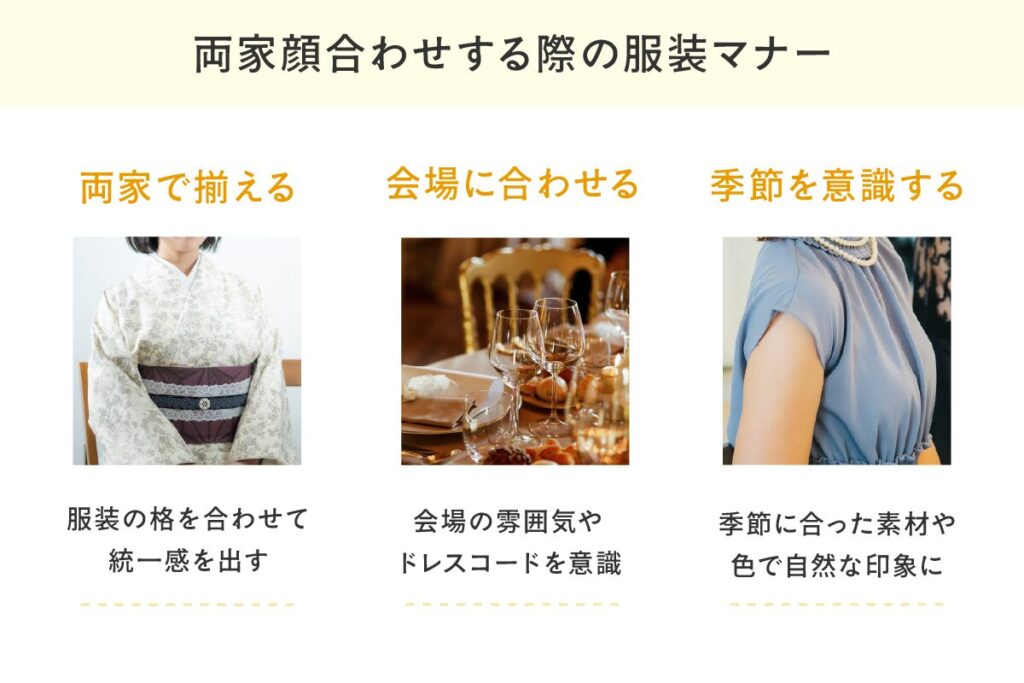 統一感のある服装選びを心掛け、両家がリラックスして会話を楽しめる場を作りましょう。