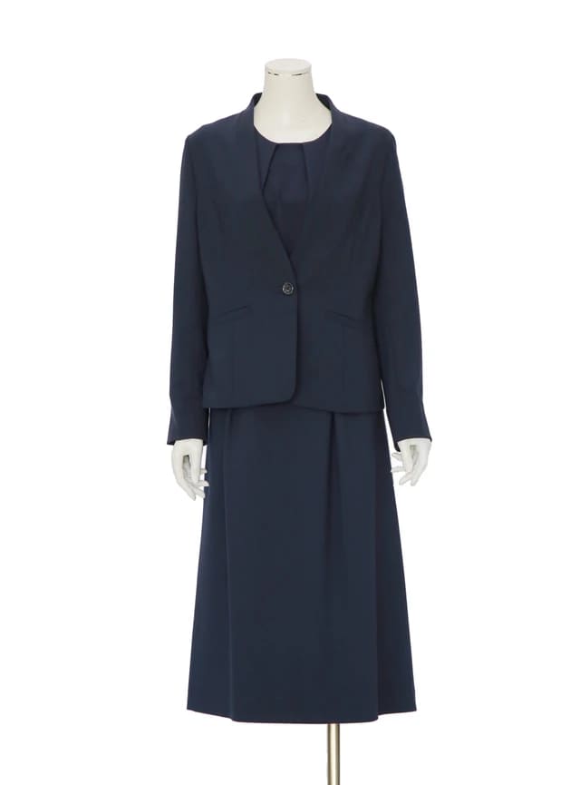 首元が適度に隠れたブラウスとロング丈のスカート、長袖丈のジャケットのセットです。露出を抑えつつも、かっちりしすぎないカラーレスジャケットにより、セミフォーマルな場にぴったりのデザインとなっています。上下セパレートタイプのため、お手持ちのブラウスやパンツと合わせてみてもよいでしょう。