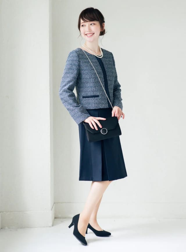 素材はツイードやウールなど、上質なものを選ぶのがおすすめです。フォーマルさを引き立てつつ、上品で落ち着いた印象を与えられます。