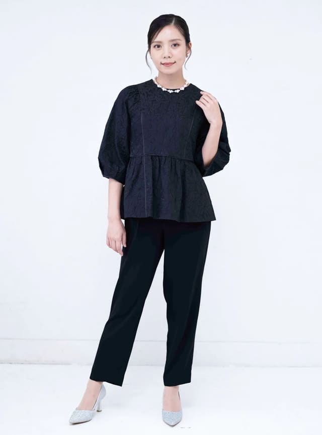 ジャガード素材と花刺繍が特徴的なトップスと、ウエストゴム仕様で長時間着用も着心地楽々なパンツのセットです。トップスに程よいボリュームがあるので、体型を自然にカバーしてくれます。花柄の織りデザインは立体感があり、写真に写った際も地味になりすぎないので、記念写真の撮影時にもピッタリです。