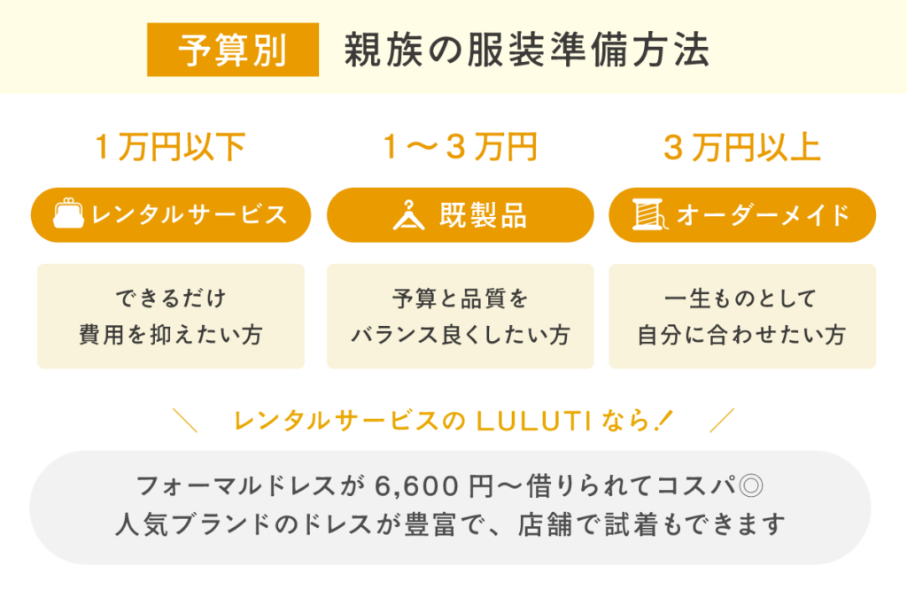結婚式で親族が着る服装について、おすすめの準備方法を予算別にまとめました。