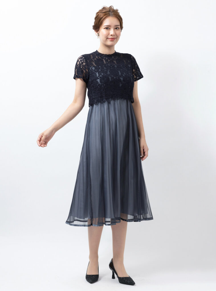 動くたびに軽やかに揺れるフィッシュテールスカートが印象的なルルティオリジナルドレス。トップスはレースのかぶせデザインで、気になる二の腕やウエスト周りをさりげなくカバー。前後で丈に差をつけたフィッシュテールデザインは、歩くたびに優雅に揺れて美脚効果も抜群です。