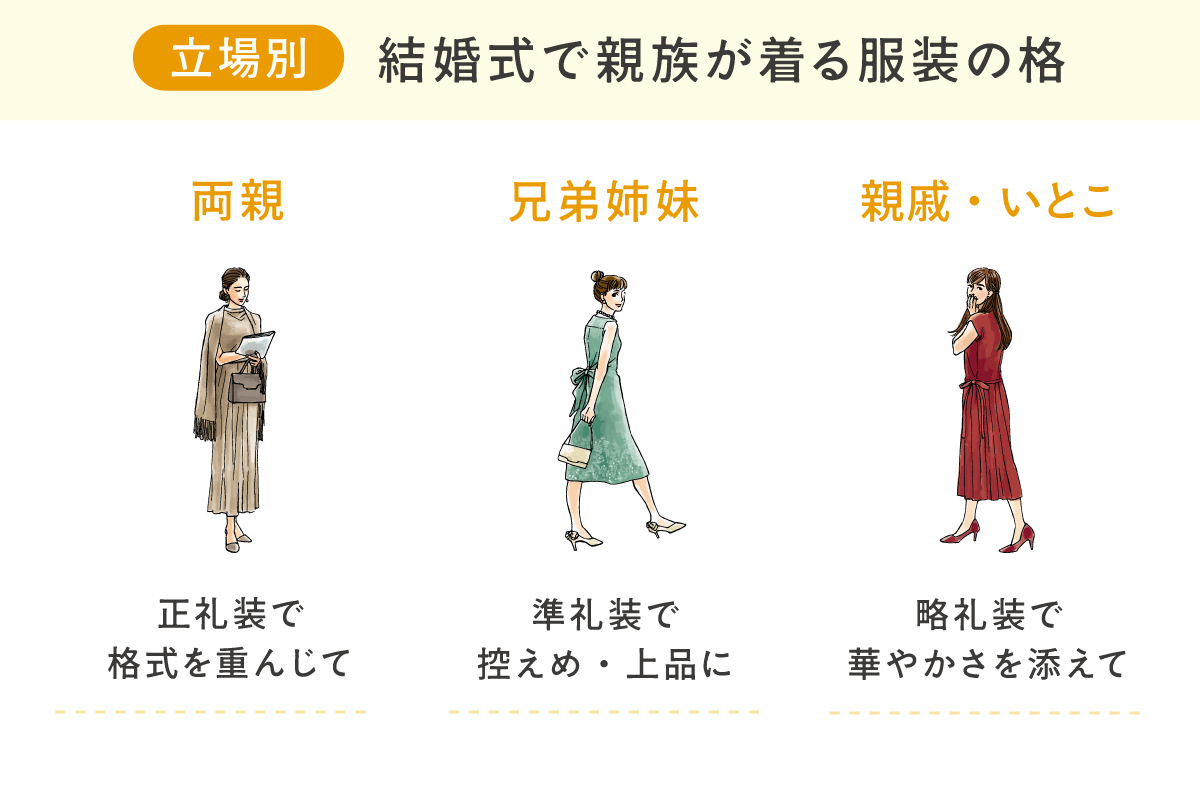 結婚式で親族が着るべき服装と選ぶポイントを、以下の立場別で紹介します。
