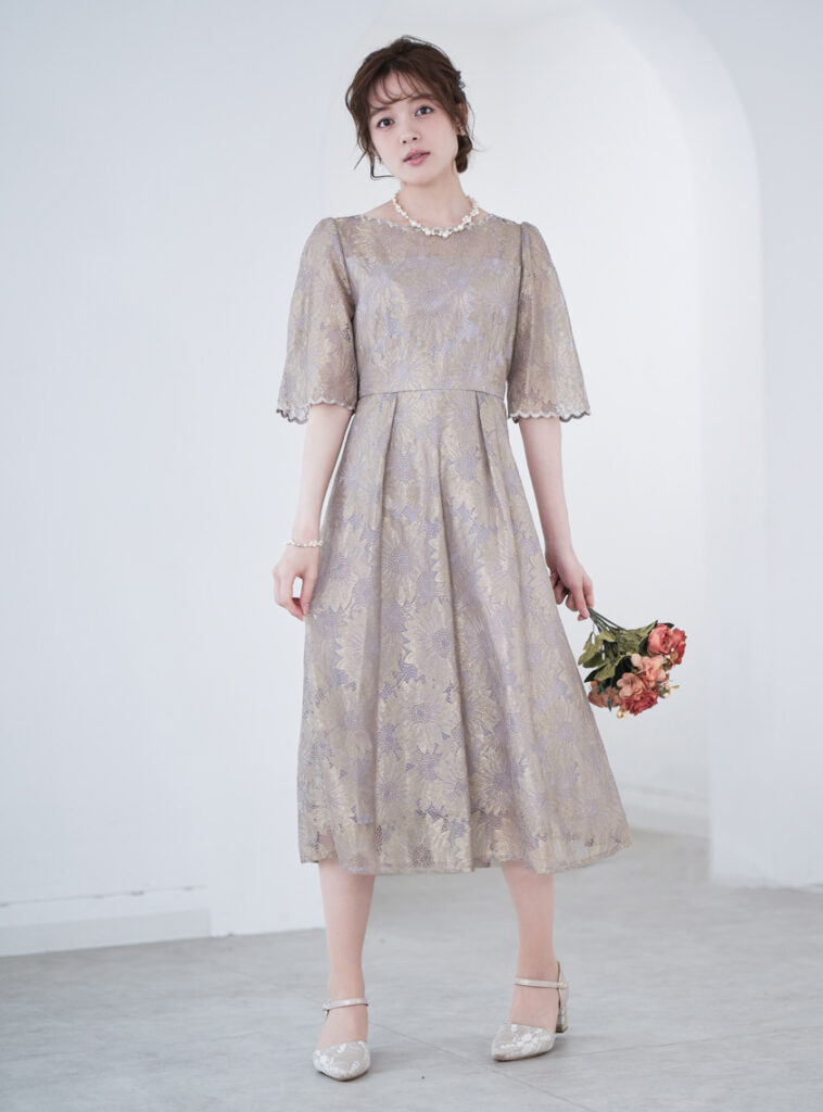 繊細な花柄刺繍とシアー素材の切り替えが美しい、上品で華やかな印象のドレス。デコルテラインを程よく透かすレースが顔まわりを明るく見せ、フェミニンで洗練された雰囲気を演出します。軽やかでありながらも高級感のある仕上がりです。