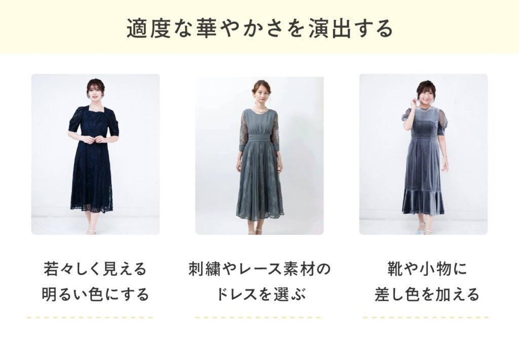 お祝いの場を彩るためにも、華やかさは必要です。レース素材や刺繍のあるドレスを選んだり、靴や小物にシルバーやゴールドなどの差し色を加えたりすると、エレガントなコーディネートに仕上がります。
