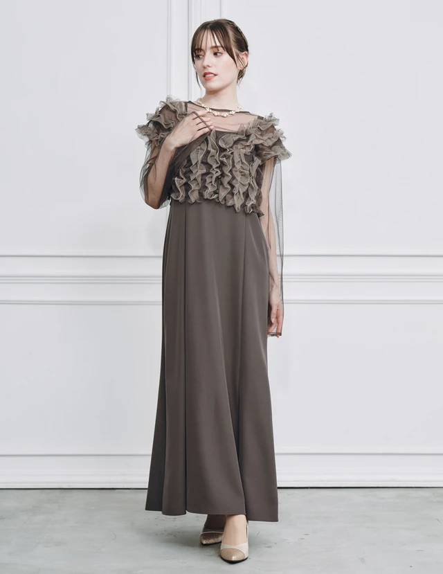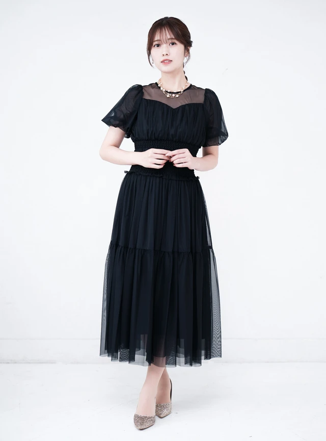 透け感のある長袖シフォンが腕まわりを軽やかにカバーしてくれるドレスです。肌を隠しながらも重たい印象にならないので、季節を問わず着用できるでしょう。トップスとスカートを重ねたようなデザインで、ウエスト位置が高く見えるから、自然にスタイルアップが叶います。