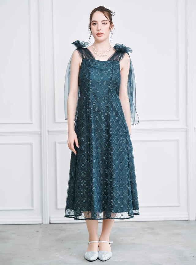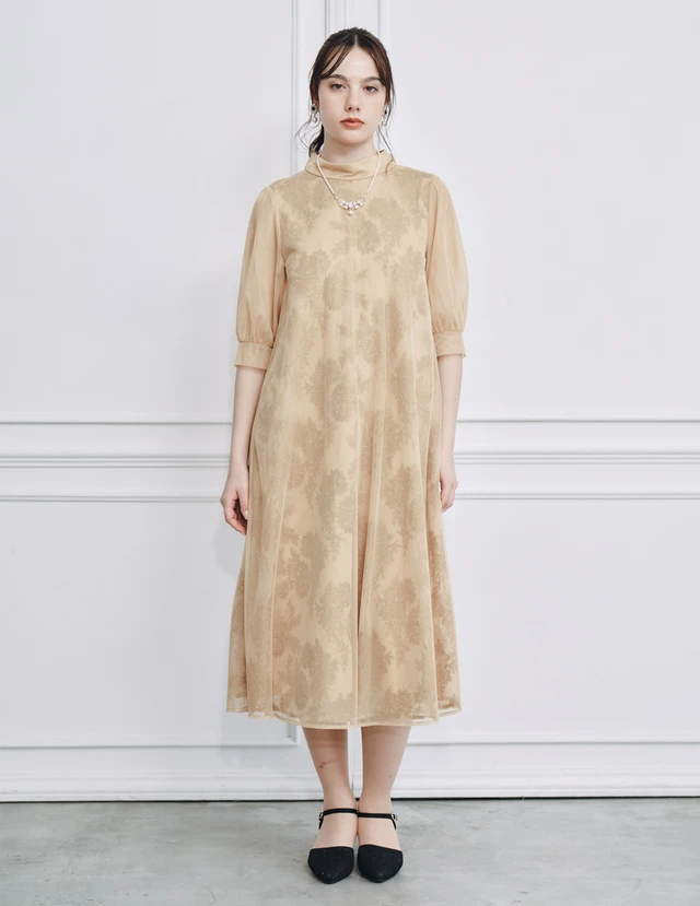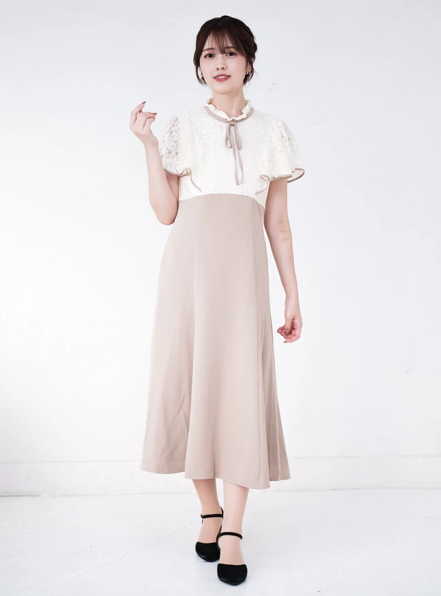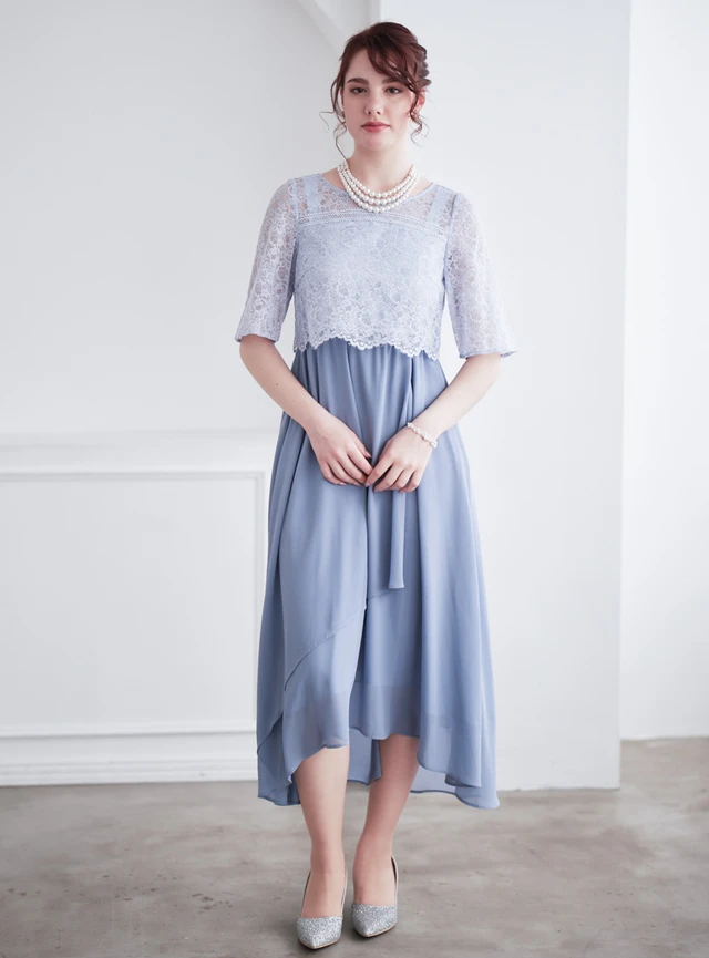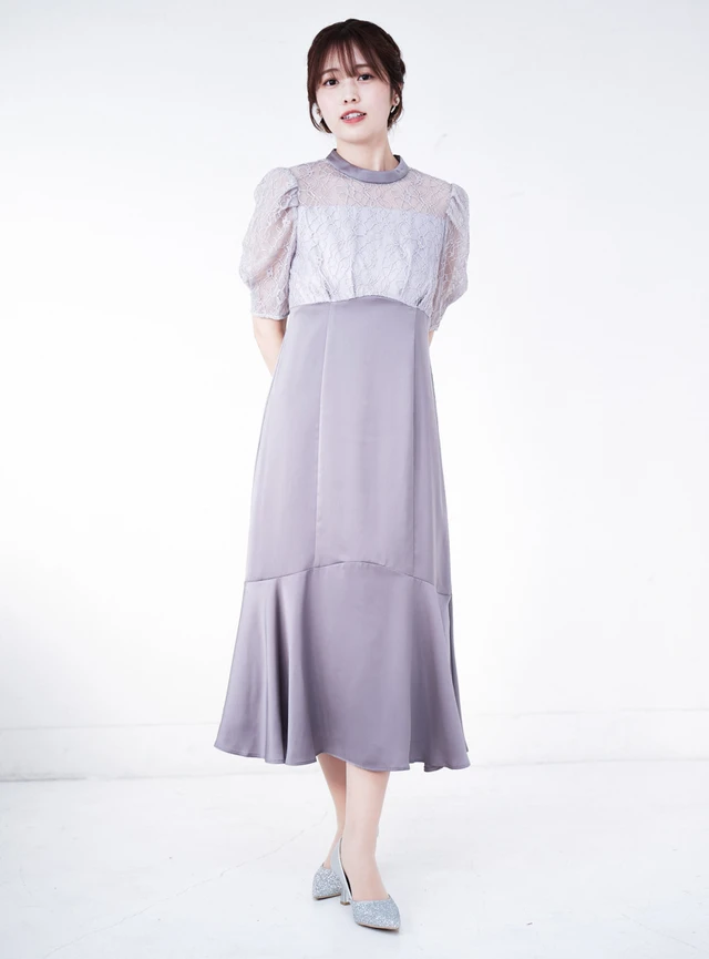 総レース仕立てでありながら派手になりすぎず、程よい透け感が上品なドレスです。ウエストの高い位置で切り替えを入れているため、自然に脚長効果を演出。柔らかなプリーツが縦のラインを強調し、全体をすっきり見せてくれます。