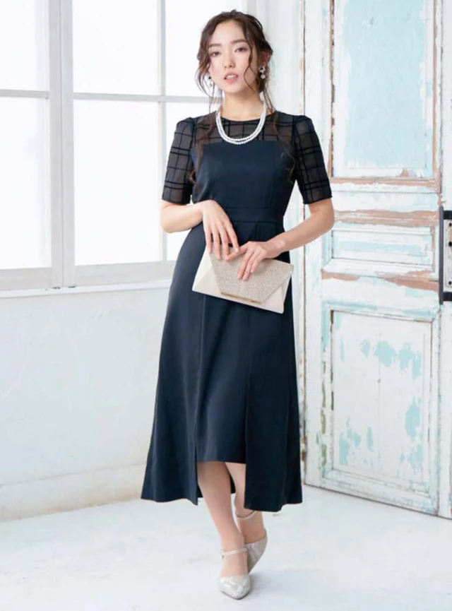 ミモレ丈・ロング丈のドレスはトレンド感があり、落ち着いた印象を与えます。
