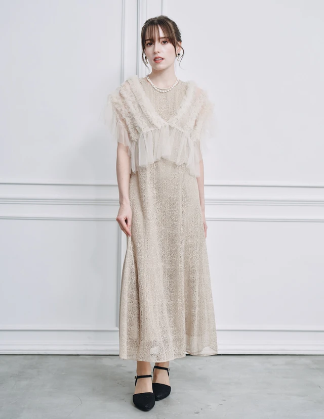 ひざ下からふくらはぎにかかる丈感が、露出を控えながらも上品な印象を演出します。フォーマルな場にふさわしい落ち着きをもちつつ、動くたびに揺れる裾が華やかさを添えてくれますよ。透け感のあるラメチュールは派手すぎず控えめなラメ感なので、30代の女性でも品よく着こなせます。
