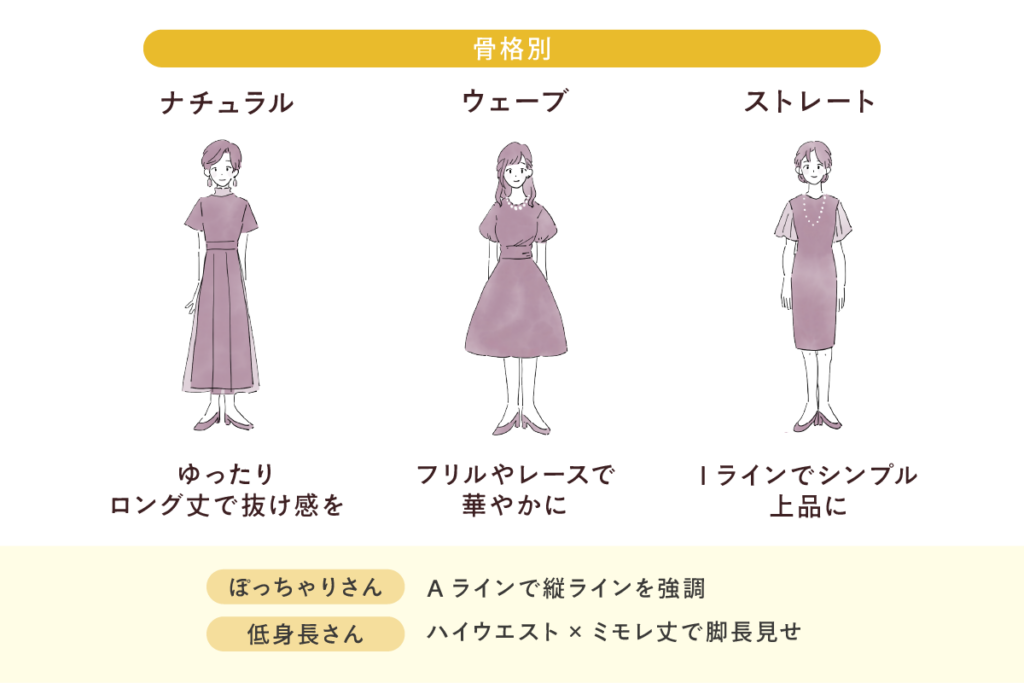 控えめな色のドレスや袖付き、ロング丈のドレスなどが適しています。フォーマルを意識しすぎて、雰囲気が重くなりすぎないよう注意することも大切です。