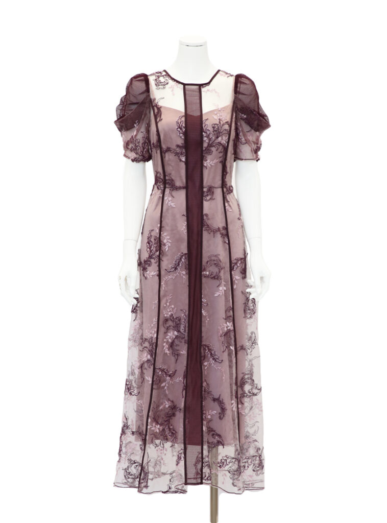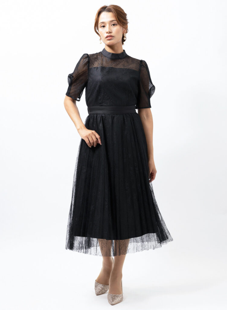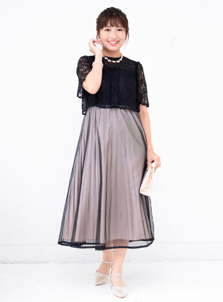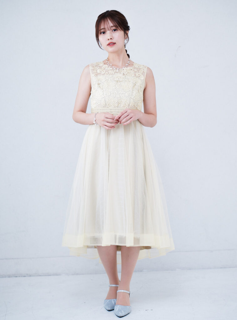 トップスは繊細なレース、スカートは軽やかなチュール素材を組み合わせたワンピースドレス。控えめながら立体感のあるデザインが、落ち着いた華やかさを引き立てます。派手になりすぎないマットな素材感なので、多様な年代の方がいる親族席にもよくなじみます。