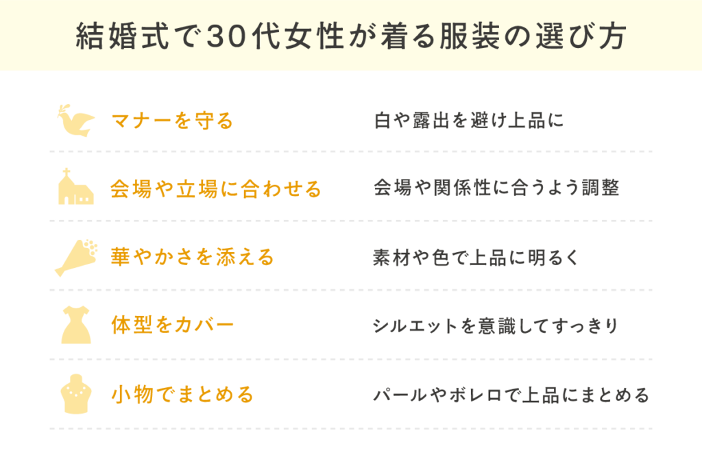 結婚式で30代女性が着る服装の選び方は、以下の5つが挙げられます。