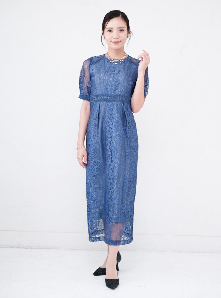 総レース仕立てでありながら派手になりすぎず、程よい透け感が上品なドレスです。ウエストの高い位置で切り替えを入れているため、自然に脚長効果を演出。柔らかなプリーツが縦のラインを強調し、全体をすっきり見せてくれます。