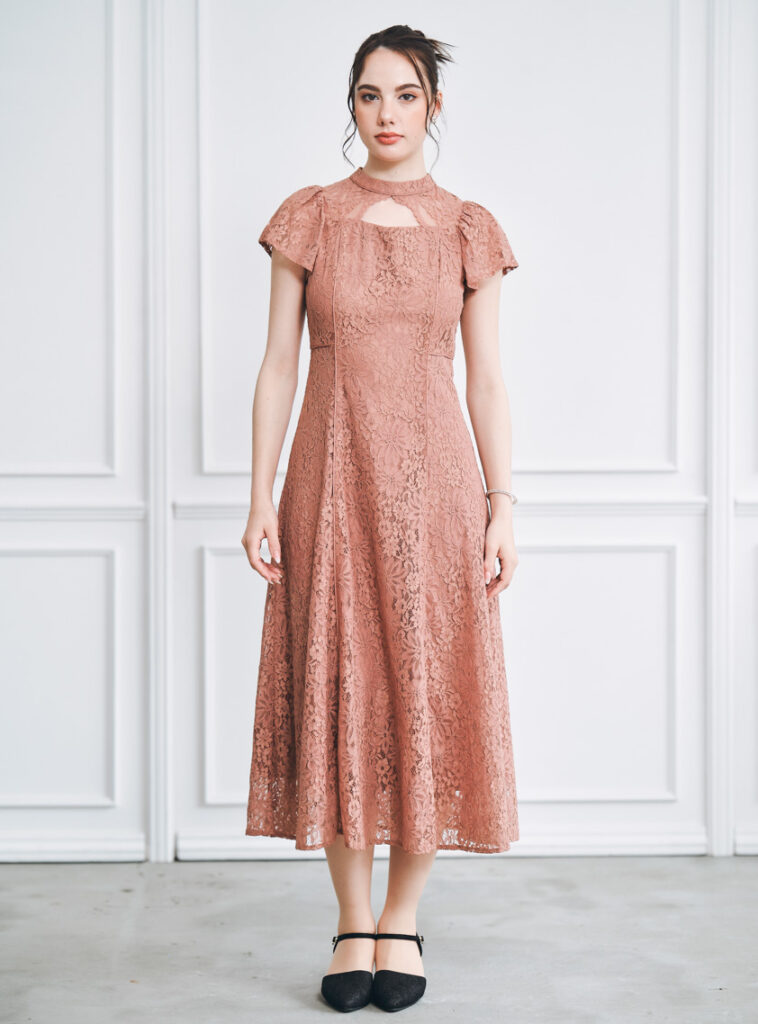 露出を抑えながらも、透け感のあるレース袖が軽やかさをプラス。フレアに広がるスカートが歩くたびに揺れ、華やかさと動きを感じさせます。落ち着きすぎず、適度にフェミニンさをアピールできるデザインなので、友人として参列するときにぴったりです。