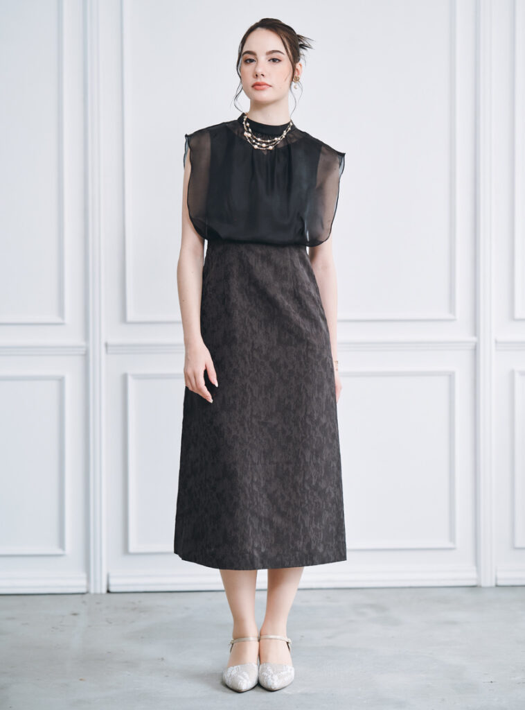 シルバーの靴やパールネックレスを組み合わせると、エレガントなコーディネートにまとまります。