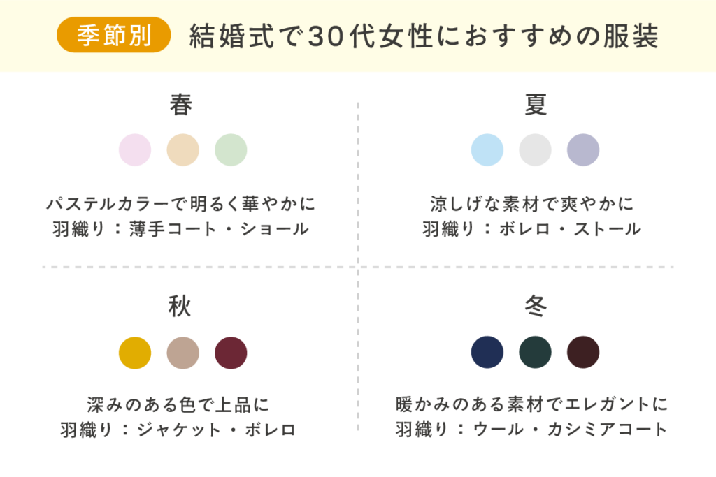 「結婚式で30代女性におすすめの服装はある?」